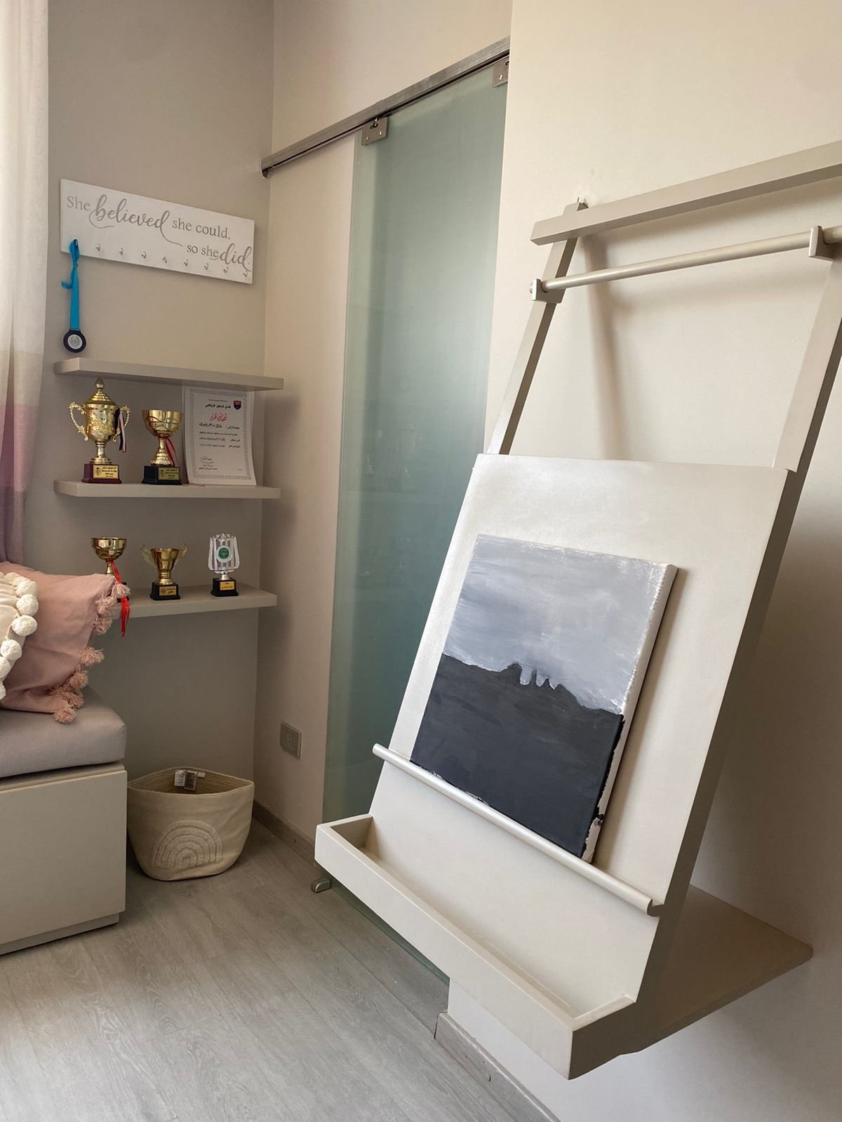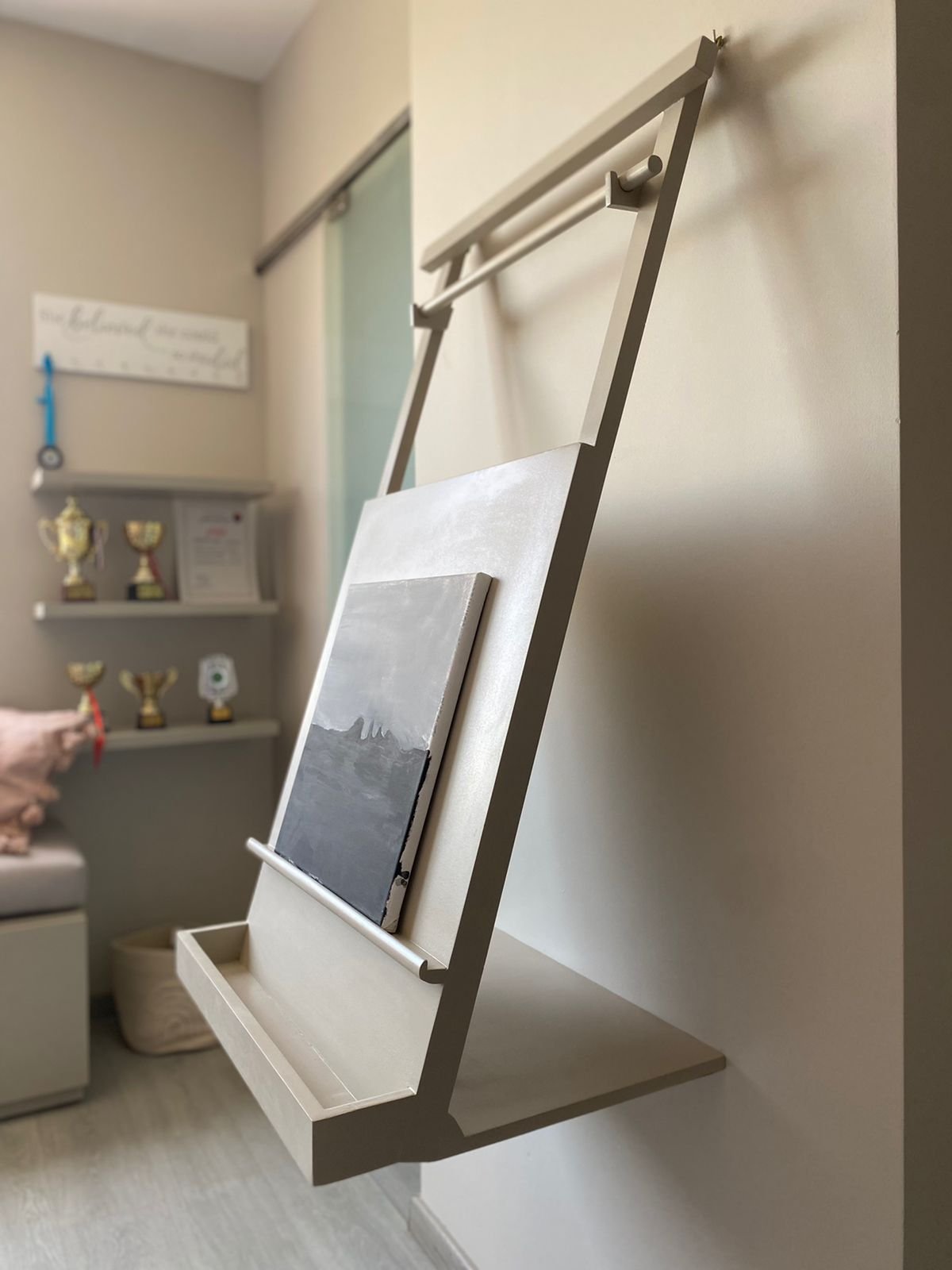 تصميم موفّر للمساحة: هيكل جداري مُعلّق يغنيكِ عن حوامل اللوحات الأرضية الكبيرة، مثالي للشقق الصغيرة أو المساحات ذات الطابع البسيط.