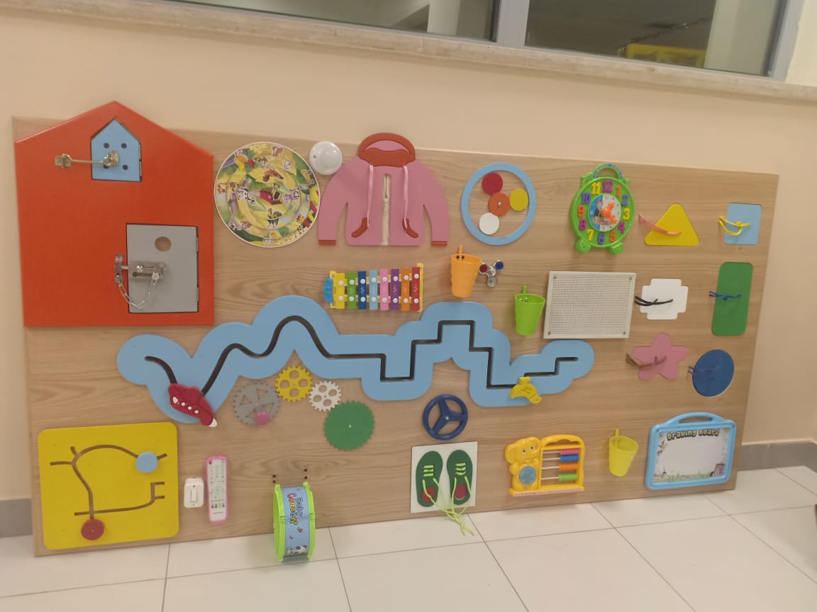 الحجم : 200 سم• نوع الخشب: خشب زان و ام دي اف• مدة التسليم: من 10 إلى 15 يوم• نوع الطلاء: دهان دوكو• لوحة أنشطة حسية كبيرة تُثبت على الحائط، مصممة لدعم تنمية الطفولة المبكرة من خلال اللعب التفاعلي.• مصنوعة من خشب طبيعي عالي الجودة بتشطيب ناعم وآمن للأطفال.• تتضمن مجموعة متنوعة من أنشطة تنمية المهارات الحركية الدقيقة مثل:ربط الخيوط ومطابقة العناصرمسار المتاهة المتحركالتروس الدوّارةلوحة تعليم الساعةباب مع تمرين القفل واللسانعجلات منزلقة دوّارة ومزلقاتعناصر موسيقية وصوتيةأدوات التعرف على الألوان والعدّلوحة الرسم والتتبع