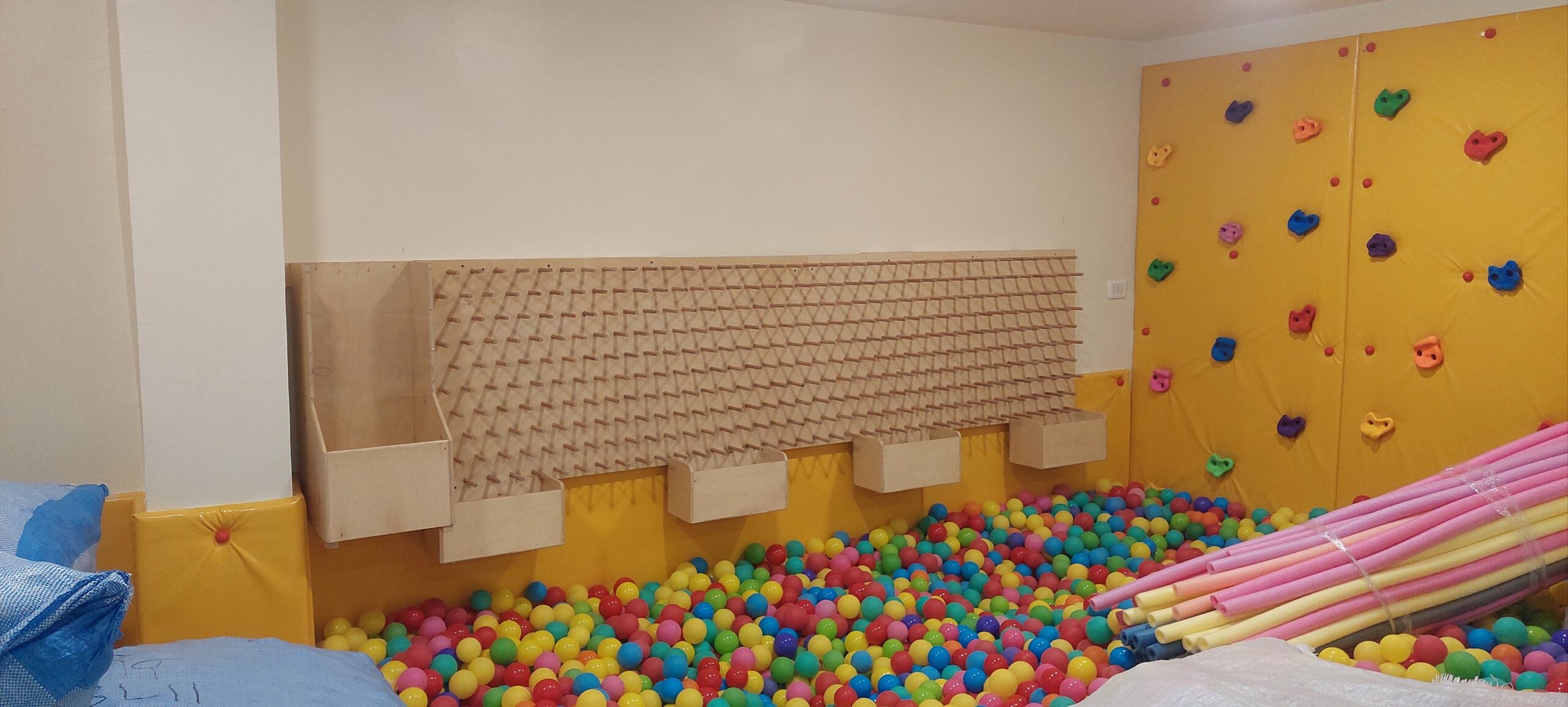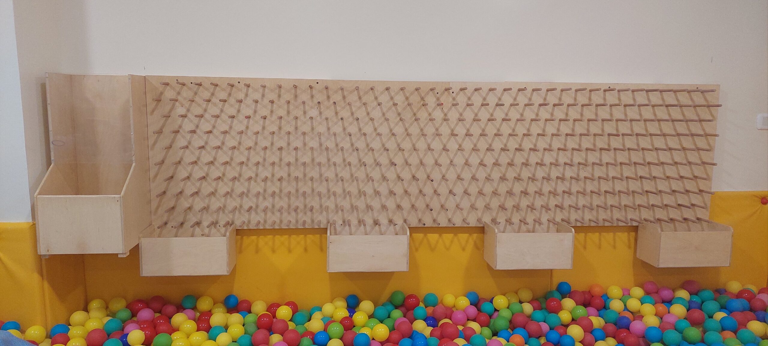 اللون: لمسة خشبية طبيعية مع لوحة قاعدة صفراء زاهية وكرات بلاستيكية متعددة الألوان (أحمر، أزرق، أخضر، أصفر)