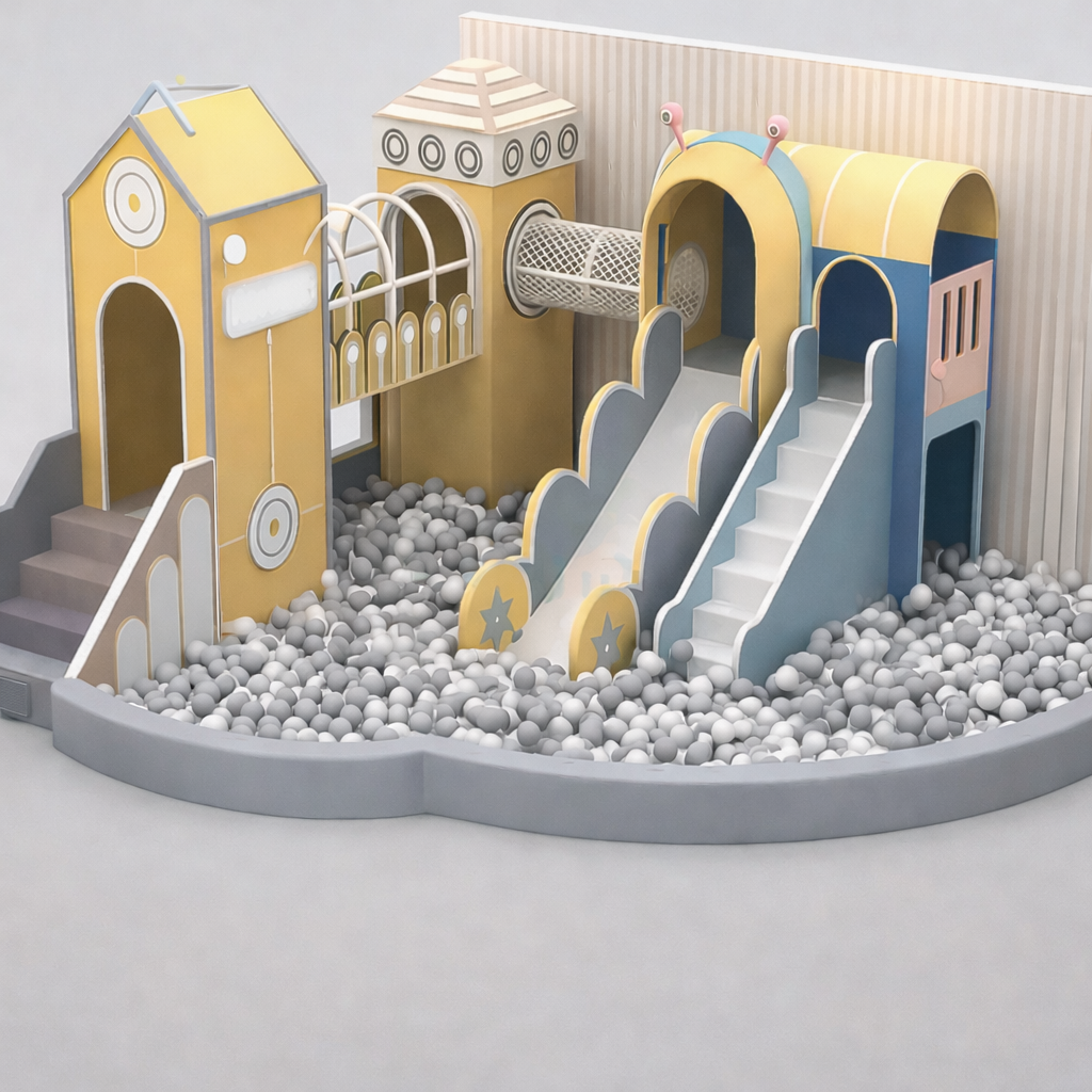 • اجعل مساحتك عالمًا من المغامرة! يتميز هذا الملعب الأنيق بتصميم باستيل ناعم ويحتوي على حوض كرات، وزحليقتين، وأنفاق زحف. تم تصميمه خصيصًا ليلائم احتياجاتك، جامعًا بين الأمان والمظهر الفاخر. • التسليم: يُصنَّع خصيصًا ويتم تسليمه خلال 15 إلى 30 يومًا.