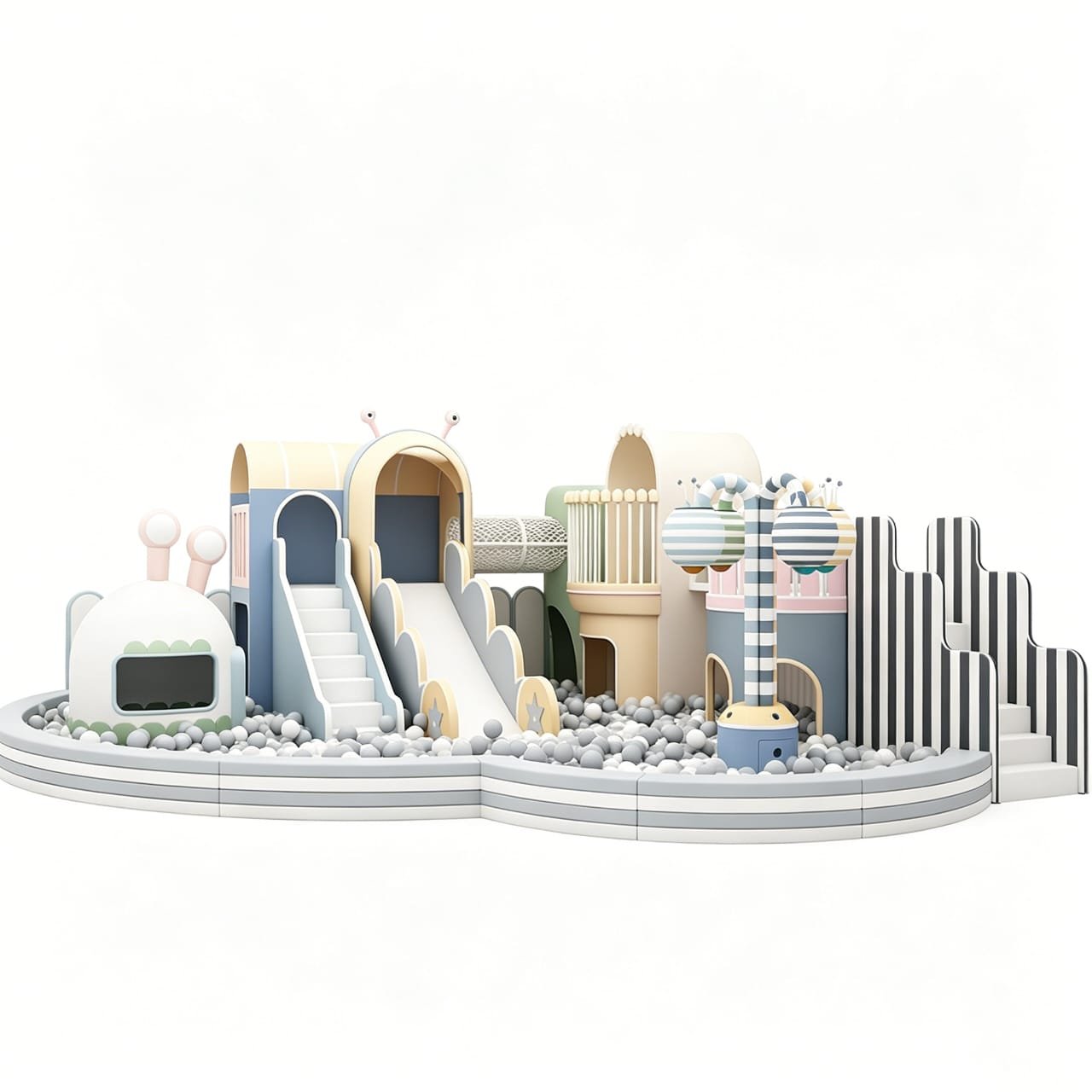 Project Area: 35 square meters.Price per square meter: EGP 7,500.Delivery & Installation: 30–40 working days from contract date.Structural Frame: High-quality plywood structure padded with dense shock-absorbing foam and upholstered with premium, easy-to-clean PVC leather.Flooring & Protection: Interlocking foam (puzzle) flooring, 1.5 cm thick, with full padding and wall/column cladding around the area for child safety.Play Elements:Large fiberglass slide.Deep ball pit filled with colorful medical-grade plastic balls.Elevated adventure zone with net tunnels and padded wooden bridges.Child-friendly safety stairs with hand grips.Safety Add-ons: Heavy-duty soft safety netting to prevent falls from upper levels.Warranty: 1 year on wooden structure, upholstery, and workmanship.Payment terms: 50% down payment, 25% before delivery, 25% after installation and inspection.Notes:Order confirmation is completed through WhatsApp.We can design and execute the setup for any area requested by the client.