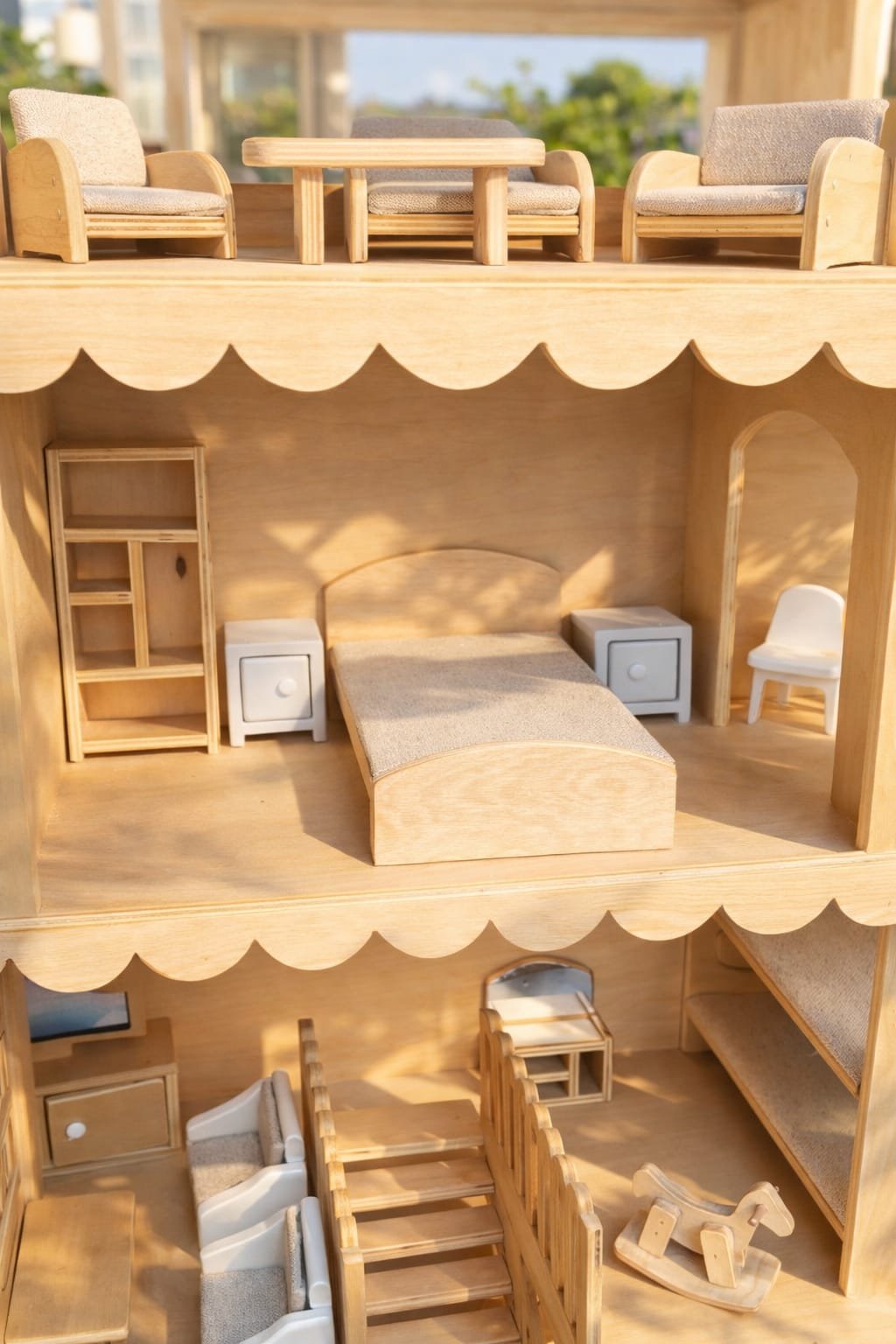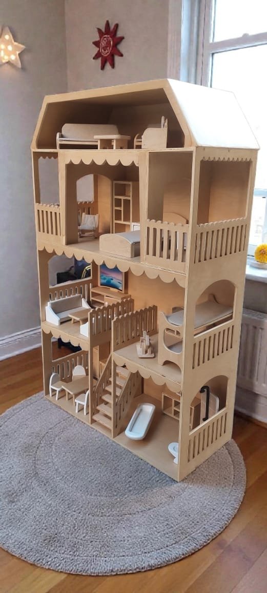 Size: 90 × 130 × 40 cm Material: MDF Color: Wood finish Delivery: 10–15 days 📦• • Floors: 3 spacious levels connected with a central staircase • Rooms & Layout: Living Room (1): Includes seating area, table, and TV unit Dining Room (1): Dining table with chairs Kitchen Area (1): Storage units and preparation space Bedroom (1): Bed, side tables, and furniture set Nursery / Kids Room (1): Includes baby furniture and play area Bathroom (1): Equipped with bathtub, toilet, and essentials Balcony / Terrace Areas (2): Decorative open spaces Upper Lounge Area (1): Relaxing seating space Total Rooms & Functional Spaces: 8 • Furniture: Includes detailed miniature wooden furniture for each room • Design: Open-front design for easy access and interactive play • Style: Modern, elegant, and realistic house layout • Assembly: Ready for use • Suitable For: Kids’ playrooms, educational play, and decorative display