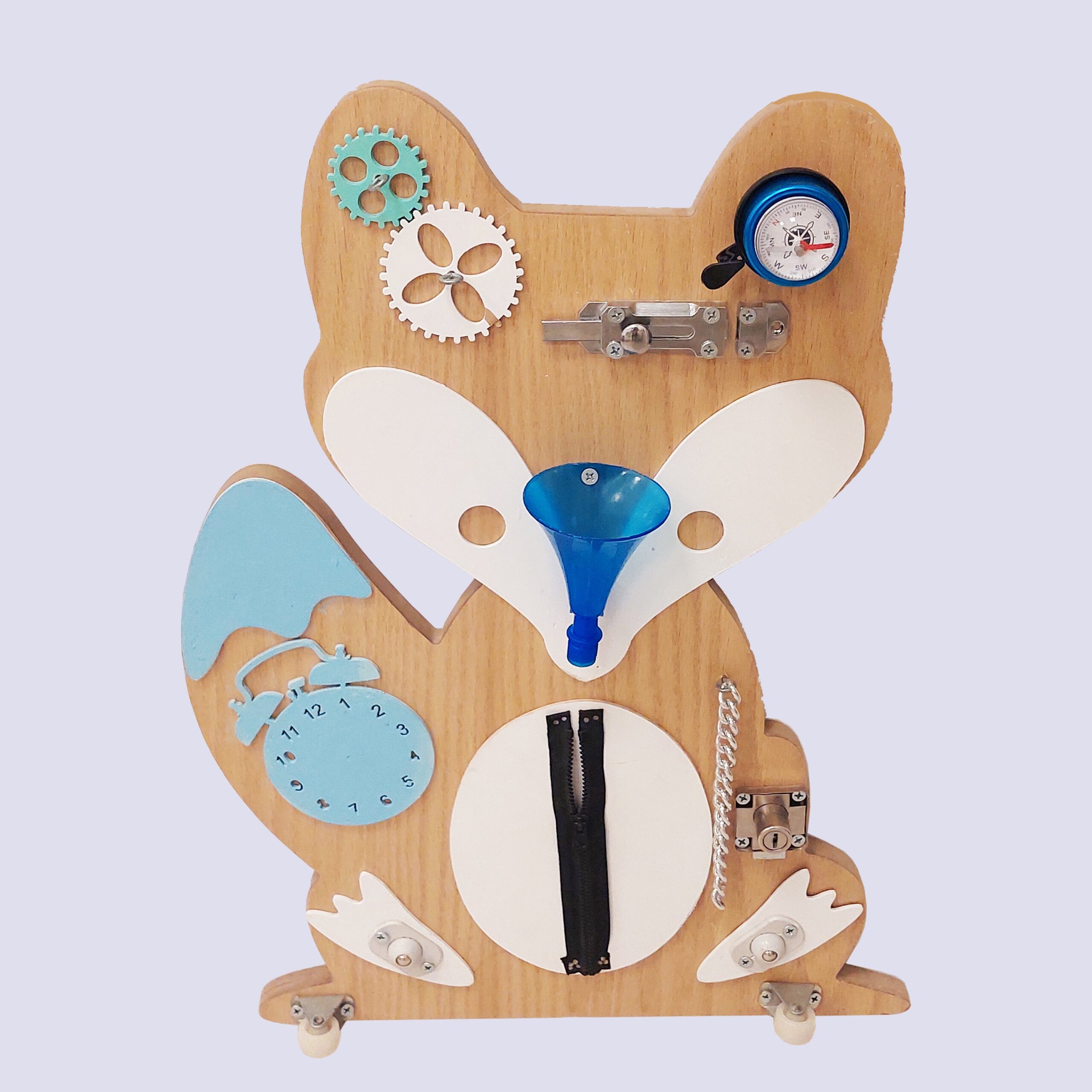 size:60 (W)•Wood type:Plain counter wood &mdf•delivery time:10 to15 days•Paint type: Duco•Wooden fox-shaped Montessori busy board•Designed to enhance fine motor skills and sensory development•Helps improve hand-eye coordination and problem-solving skills•Includes interactive elements: rotating gears, sliding latch, zipper, chain lock, mini clock, pressure gauge, funnel, and switches•Encourages independent play and practical life skills•Smooth edges and child-safe finishing•Wall-mountable design for easy installation Perfect for toddlers and preschoolers•Color:-Natural wood finish -Soft white details -Light blue accents