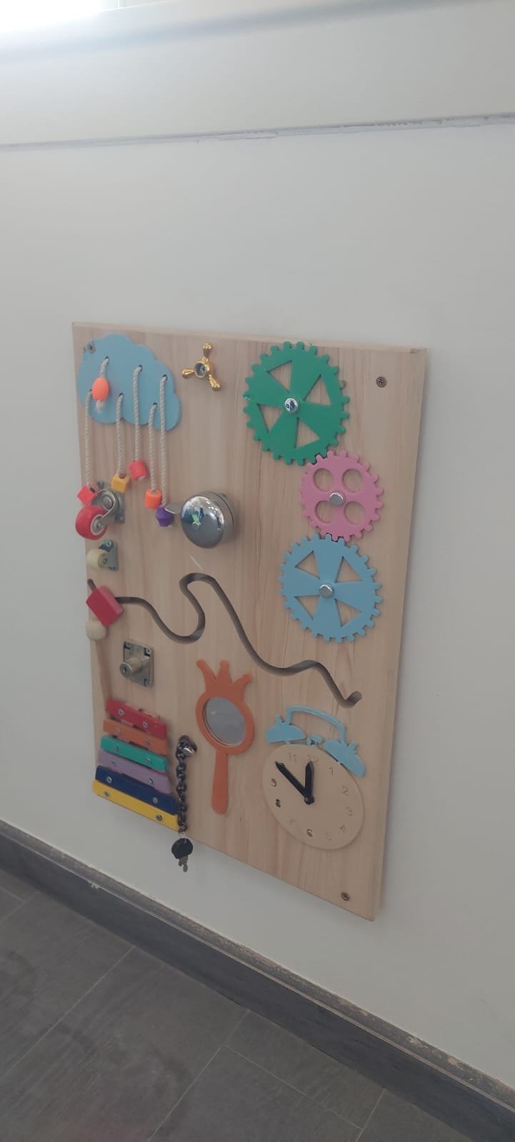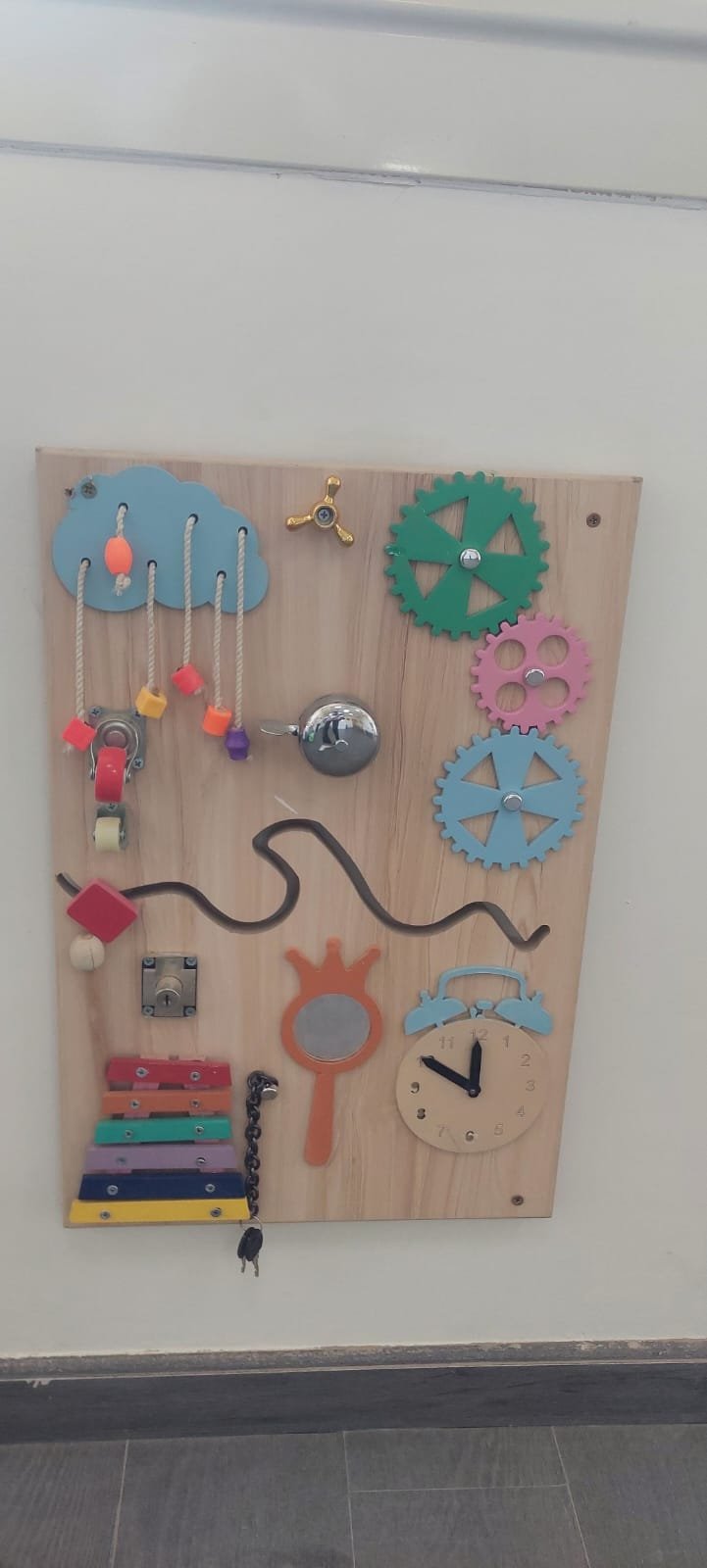 •size:40*60•Wood type:mdf•Delivery Time: 10 to 15 days•Paint type: Duco•Multi-activity Montessori busy board designed to develop fine motor skills and hand-eye coordination•Made from high-quality natural wood with a smooth, child-safe finish•Wall-mounted design, perfect for playrooms, nurseries, classrooms, and kids’ corners•Encourages independent play, sensory exploration, and early learning•Features Include:-Spinning colorful gear wheels-Rope and bead threading activity with cloud design-Rotating metal bell-Sliding wire maze with wooden block-Lock and latch mechanism with key-Mini xylophone with metal keys-Rotating faucet handle-Child-friendly learning clock with movable hands-Safety mirror for self-discovery play-Rolling wheels and mechanical elements for tactile interaction•Color: