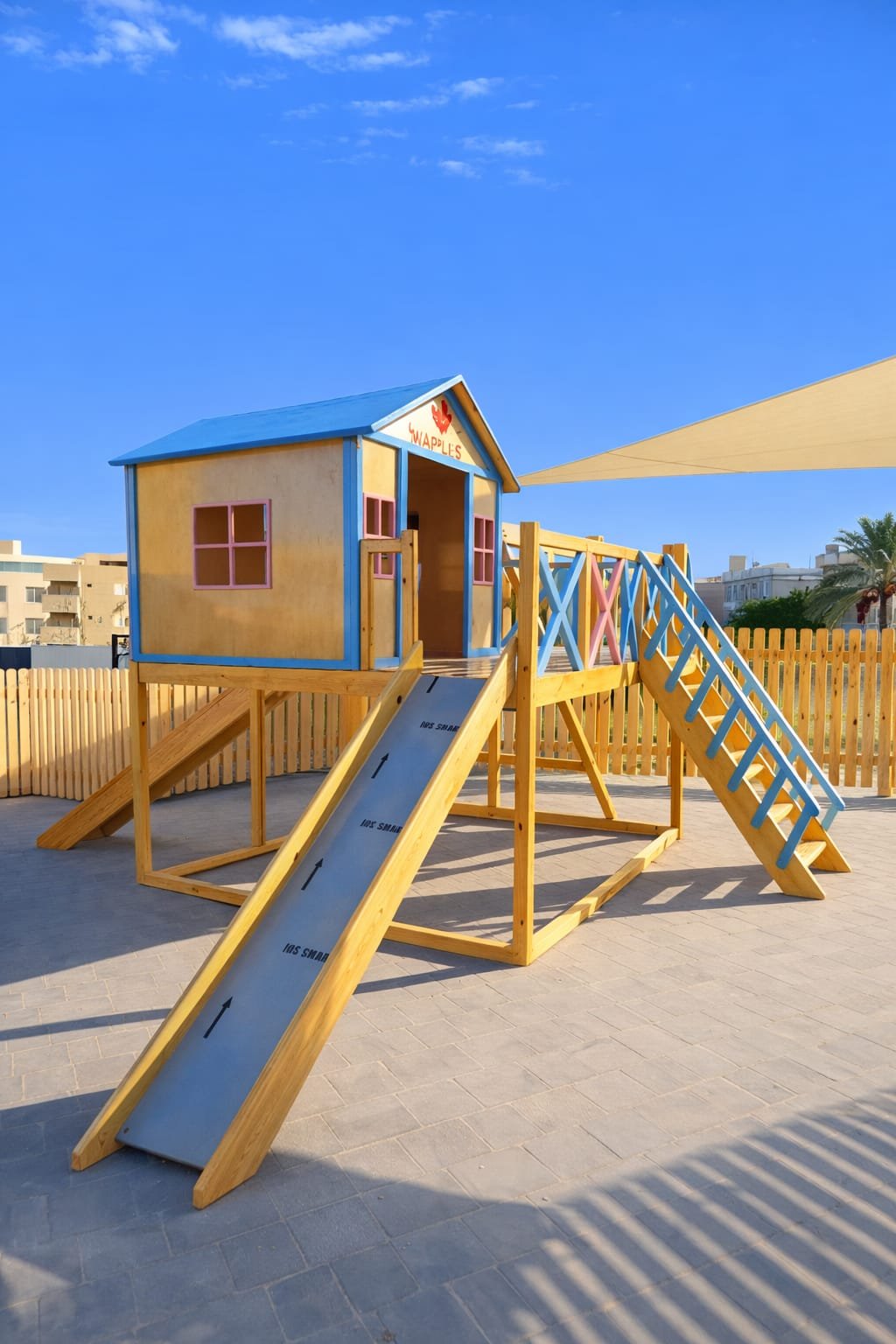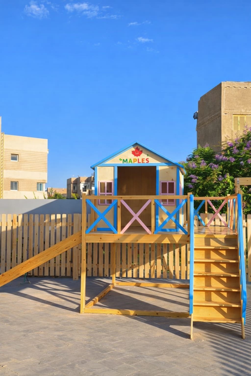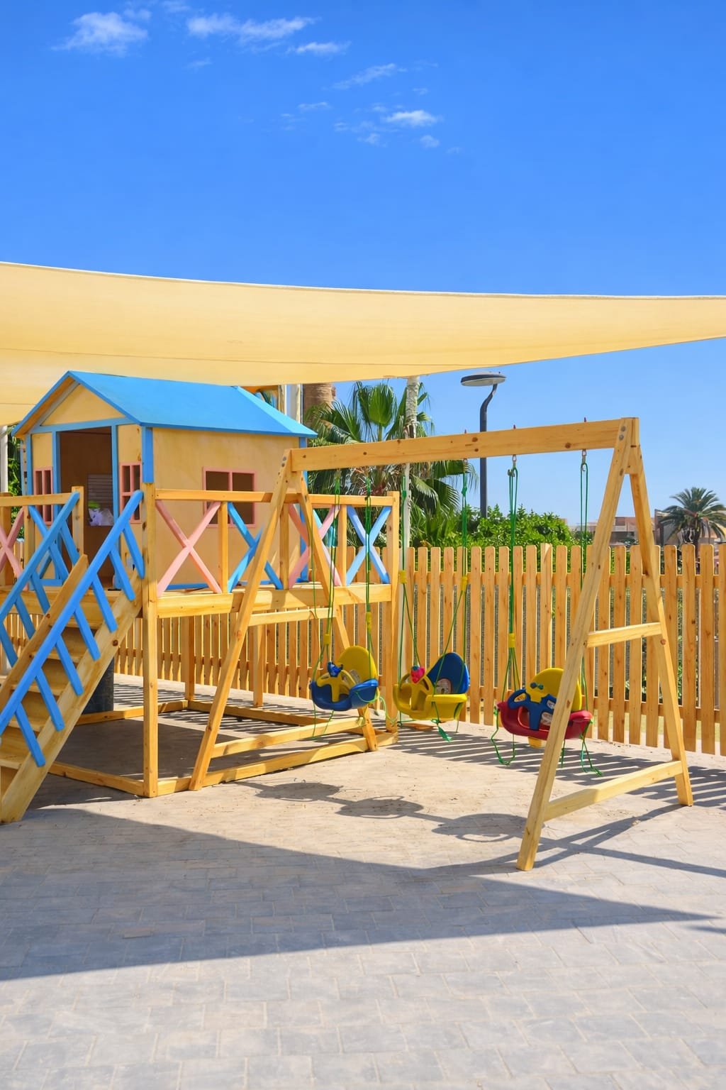 Elevated wooden playhouse designed for outdoor useMade from high-quality, durable natural woodBright, cheerful color palette that attracts kids and enhances outdoor spacesSpacious playhouse cabin with windows and open entranceSafe wooden staircase for easy climbingSmooth slide designed for fun and safe playIntegrated swing set with multiple child-friendly swing seatsStrong, stable wooden frame for maximum safetyEncourages imaginative play, physical activity, and social interactionIdeal for gardens, nurseries, schools, and kids? play areasFinished with child-safe paints and smooth edgesDesigned to withstand outdoor weather conditions