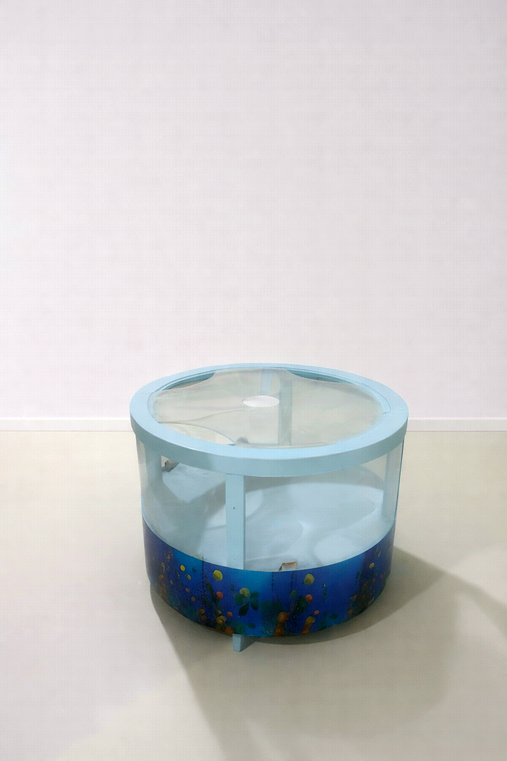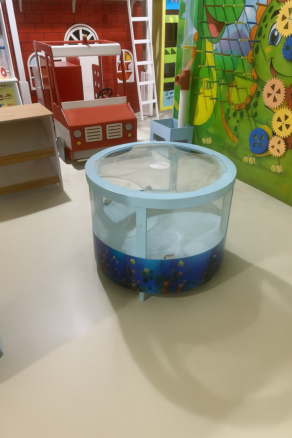 •size: 80*55•Material: MDF•Delivery Time:10 _15 days•Design: A circular, aquarium-style toy tank designed for role-playing and motor skills development.•Top Feature: Open-top design for easy access with toy fishing rods and accessories.•Visuals: Decorated with a vibrant "Under the Sea" wrap featuring colorful fish and coral reefs.•Construction: Lightweight and durable frame with transparent side panels to see the "catch" from all angles.