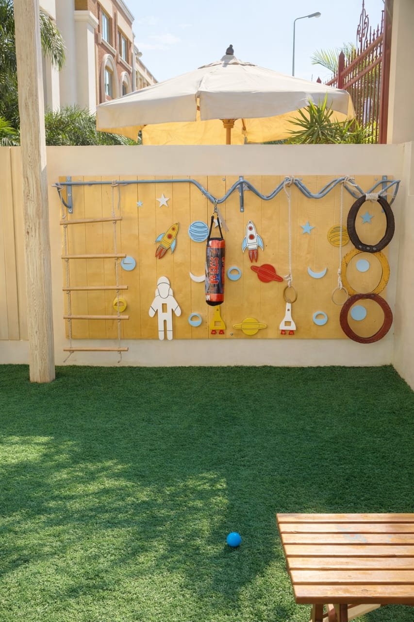 •size: 280*150•Material: mdf•Delivery Time: 10 to 15 days•Color: Soft yellow background with colorful space-themed details• Multi-functional outdoor activity wall designed to encourage movement, balance, and imaginative play• Space-themed design with rockets, planets, astronaut figure, and decorative elements• Includes climbing ladder, hanging ropes, rings, and soft punching bag for active play• Helps develop motor skills, coordination, and strength in a fun and engaging way• Wall-mounted design, ideal for gardens, play areas, nurseries, or kids’ activity zones• Durable structure suitable for daily use• Custom-made design to fit your space and theme•Perfect for: Outdoor play areas, schools, nurseries, and home activity corners.